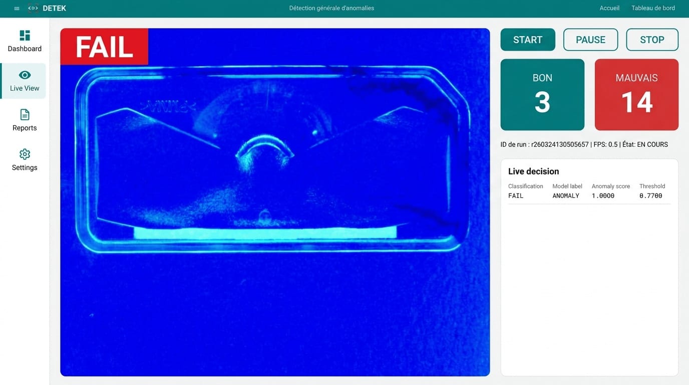DETEK opera dentro de la red de planta, cerca de la cámara y del flujo de producción. Esto permite inferencia de baja latencia, control local de datos e integración industrial.